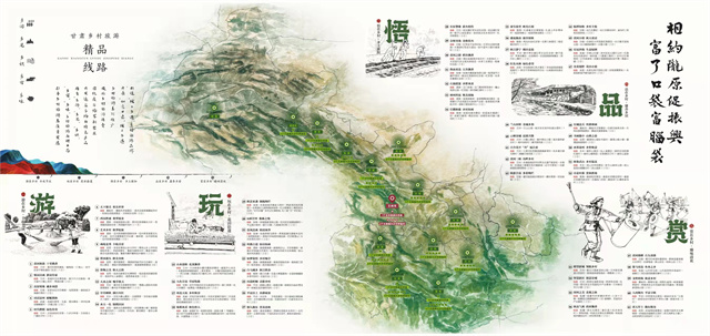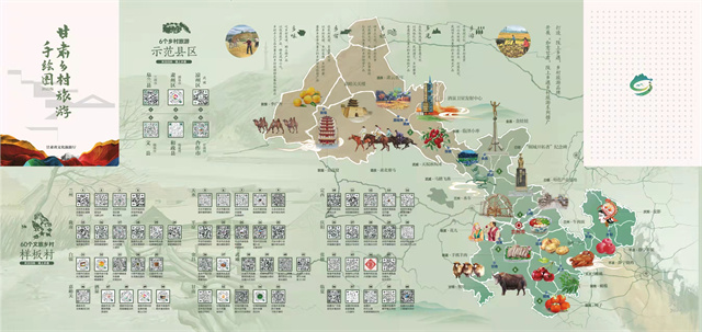 據(jù)介紹,手繪圖以“相約隴原促振興·富了口袋富腦袋”為主題,突出“圖文并茂、服務(wù)游客、便于攜帶、適于珍藏”等特點,對2022年創(chuàng)建的6個鄉(xiāng)村旅游示范縣,60個文旅振興鄉(xiāng)村樣板村全部開發(fā)設(shè)計了電子“二維碼”,設(shè)置了甘肅省鄉(xiāng)村旅游60條四季精品線路,生動形象地展現(xiàn)了甘肅鄉(xiāng)村旅游特色元素和資源產(chǎn)品信息,對幫助游客暢游甘肅鄉(xiāng)村、感知隴原文化、體驗鄉(xiāng)村魅力具有重要意義。