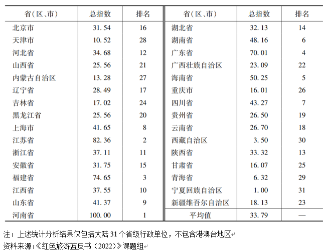 近日,北京第二外國(guó)語(yǔ)學(xué)院旅游科學(xué)學(xué)院與社會(huì)科學(xué)文獻(xiàn)出版社共同發(fā)布了紅色旅游藍(lán)皮書(shū)《中國(guó)紅色旅游發(fā)展報(bào)告(2022)》(以下簡(jiǎn)稱《藍(lán)皮書(shū)》)。《藍(lán)皮書(shū)》指出,中國(guó)紅色旅游發(fā)展水平持續(xù)提升,31個(gè)省級(jí)行政單位(不含港澳臺(tái)地區(qū))的紅色旅游發(fā)展指數(shù)排名中,位列前十的依次為河南省、江蘇省、福建省、廣東省、海南省、湖南省、四川省、上海市、山東省、江西省。