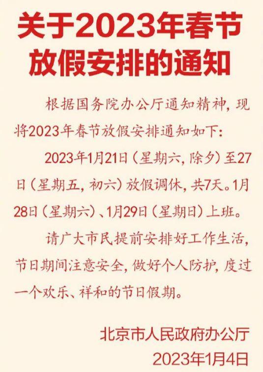 1月4日,北京市人民政府辦公廳發(fā)布《關(guān)于2023年春節(jié)放假安排的通知》(以下簡(jiǎn)稱《通知》)。《通知》指出,根據(jù)國(guó)務(wù)院辦公廳通知精神,現(xiàn)將2023年春節(jié)放假安排通知如下:2023年1月21日(星期六,除夕)至27日(星期五,初六)放假調(diào)休,共7天。1月28日(星期六)、1月29日(星期日)上班。