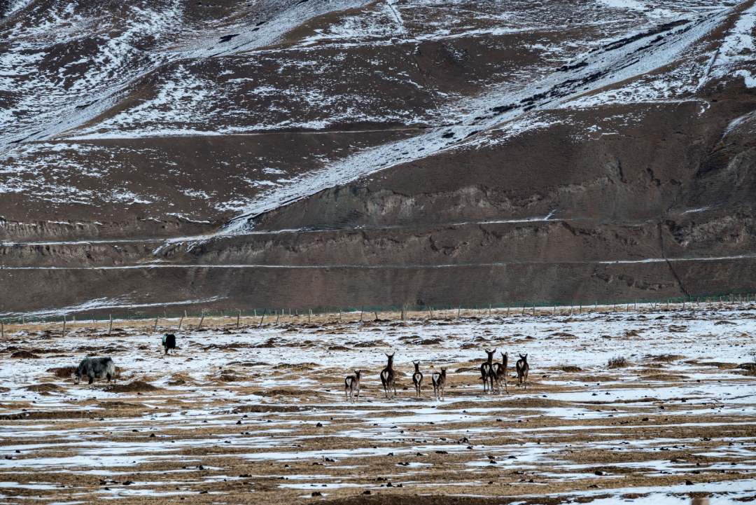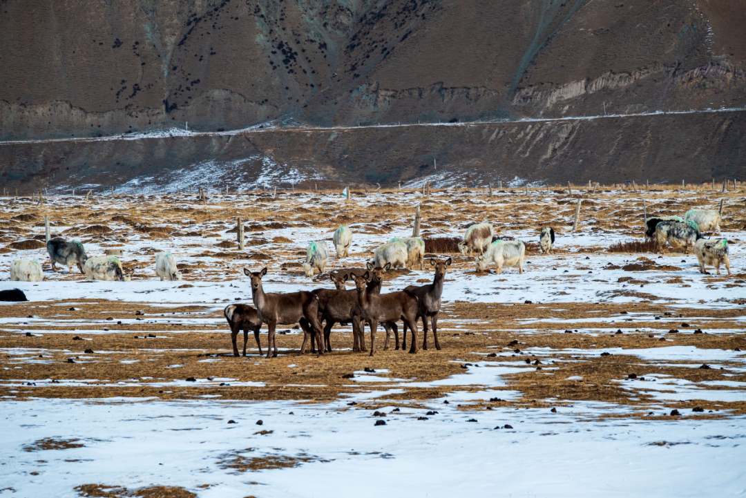 近日,在武威市天祝藏族自治縣抓喜秀龍草原上,野生的狍鹿和牧民家養(yǎng)的白牦牛同食牧草,構(gòu)成一幅和諧動人的自然圖景。張廷愛攝。