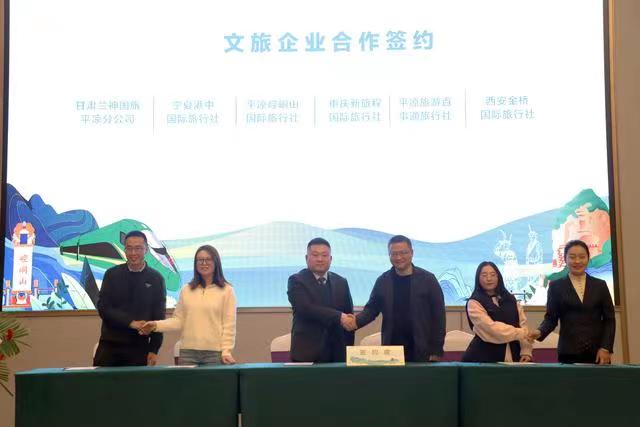 專題推介會(huì)上,平?jīng)鍪形幕瘡V電和旅游局推介了全市文旅資源及“引客入平”系列支持政策,崆峒山、大云寺·王母宮、龍泉寺、云崖寺等重點(diǎn)景區(qū)和涇川橙香瑤池溫泉酒店分別作了主題推介。平?jīng)鑫穆猛豆九c西安一帶一路文旅公司、涇川大云恒盛旅游公司與西安黃河國(guó)旅、崇信公劉文旅投公司與寶雞春暉旅行社、莊浪關(guān)山文旅投公司與寧夏新文化國(guó)旅、崆峒山國(guó)旅與重慶新旅程國(guó)旅、甘肅蘭神國(guó)旅平?jīng)龇止九c寧夏港中國(guó)旅、平?jīng)雎糜伟偈峦ㄅc西安金橋國(guó)旅等14家省內(nèi)外旅行社分別簽訂“引客入平”客源互送合作協(xié)議。推介環(huán)節(jié)還進(jìn)行了《神仙留戀的好地方》《崆峒武術(shù)魂》《折柳》和《春天的芭蕾》等文藝表演,與會(huì)嘉賓參觀了“問(wèn)道崆峒·養(yǎng)生平?jīng)?rdquo;文旅形象圖片展、文旅產(chǎn)品市集、非遺技藝展示及網(wǎng)絡(luò)直播和非遺文創(chuàng)產(chǎn)品展。甘肅省文旅廳有關(guān)處室、各相關(guān)市州文旅部門負(fù)責(zé)人和省內(nèi)外旅行商、文旅企業(yè)、媒體記者代表,平?jīng)鍪兄攸c(diǎn)景區(qū)、文旅投公司、文創(chuàng)企業(yè)代表共150余人參加。