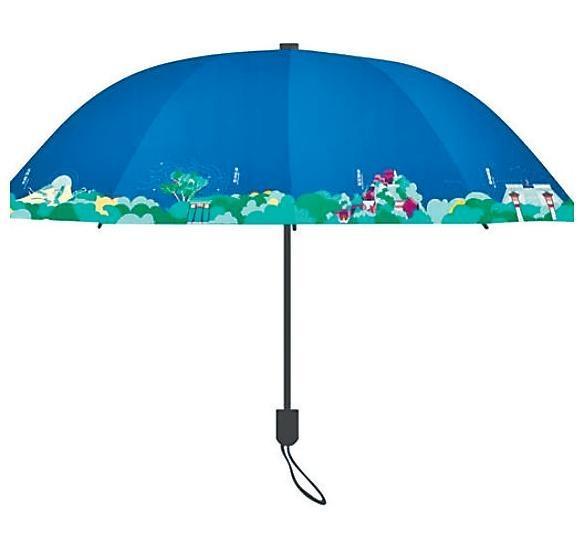 畫面是對(duì)天水文化的整合轉(zhuǎn)譯。靜謐的深藍(lán)夜色宛如舒緩溫柔的吟唱,點(diǎn)醒具有暗語(yǔ)的想象。連綿起伏的綠影又將目不暇接的八美之景串聯(lián)起墜于傘邊沿,呈現(xiàn)一種清新淡雅的格調(diào)。四字榜題作為光影與畫面間的調(diào)和劑潤(rùn)化了視覺美感,使空間溢滿文人逸趣。簡(jiǎn)潔平穩(wěn)的畫卷里隱含古雅山水的形象,靈動(dòng)漂浮的畫卷里創(chuàng)立起意蘊(yùn)美學(xué)。