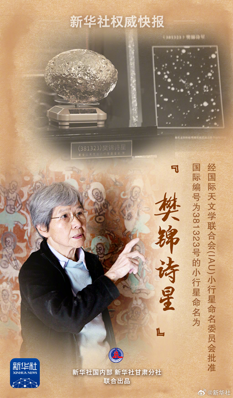 7月10日,樊錦詩(shī)從事敦煌文物工作60年座談會(huì)在敦煌舉行。會(huì)上正式命名了編號(hào)381323小行星為#樊錦詩(shī)星#。繼向北京大學(xué)捐資1000萬(wàn)元支持敦煌學(xué)研究后,樊錦詩(shī)再向中國(guó)敦煌石窟保護(hù)研究基金會(huì)捐資1000萬(wàn)元,用于敦煌文物事業(yè)發(fā)展和急需人才培養(yǎng)。捐款來(lái)自樊錦詩(shī)所獲獎(jiǎng)金及個(gè)人積蓄。(記者:張玉潔 施雨岑 張智敏)