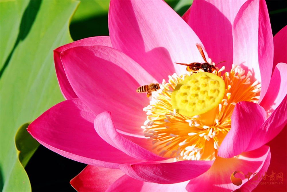 偶有蜜蜂立于荷花枝頭,在陽光下展現出別樣風采