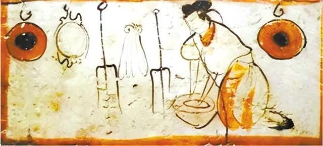 嘉峪關(guān)新城三號(hào)墓曾出土一塊畫(huà)像磚,圖為女子在盆中揉面,后面的墻上掛著鐺、箕等廚具。