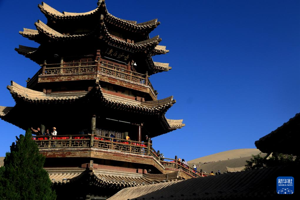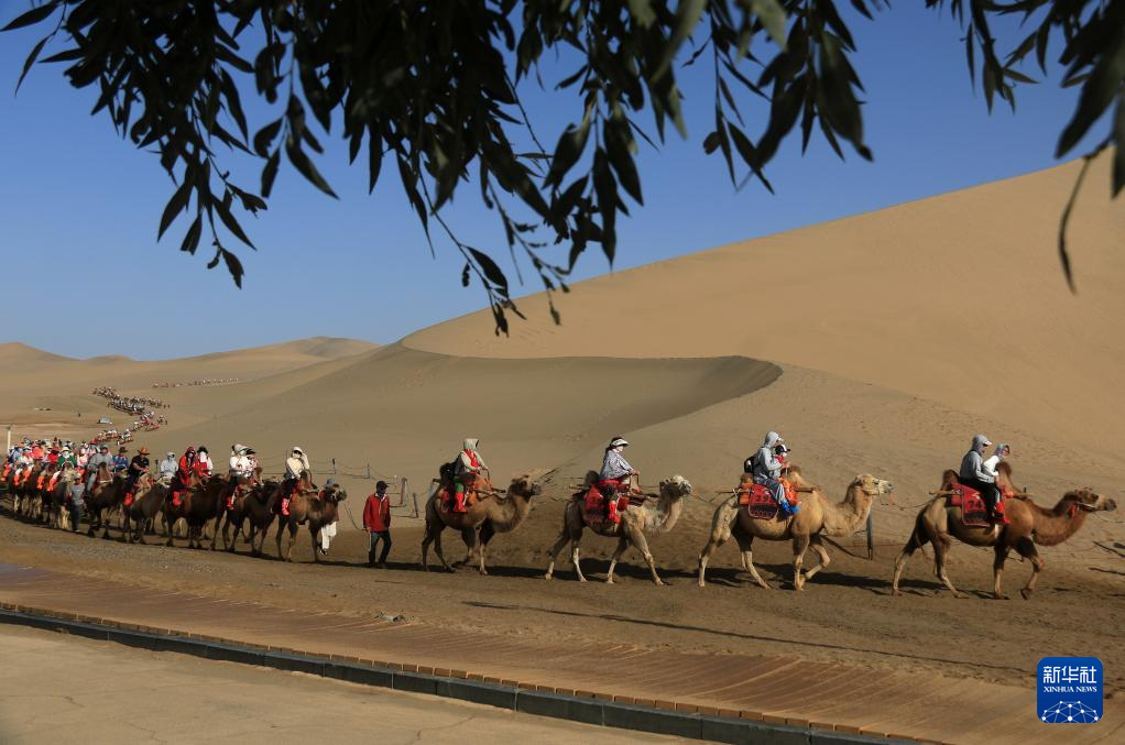 初秋時(shí)節(jié),甘肅省敦煌市碧空如洗,鳴沙山月牙泉景區(qū)景色如畫(huà),引人入勝。