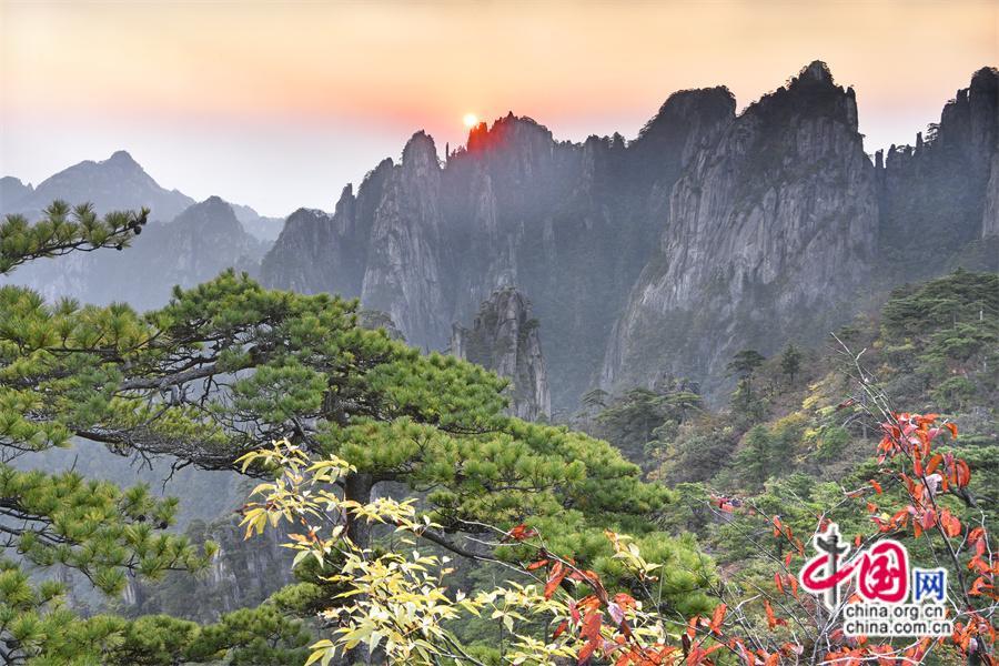 10月15日早晨,黃山風(fēng)景區(qū)晴空萬(wàn)里,旭日東升,在火紅的陽(yáng)照耀下,給本是絢麗多彩的秋色更增加了色彩飽和度,給來(lái)山的游客帶來(lái)了一場(chǎng)視覺(jué)盛宴。