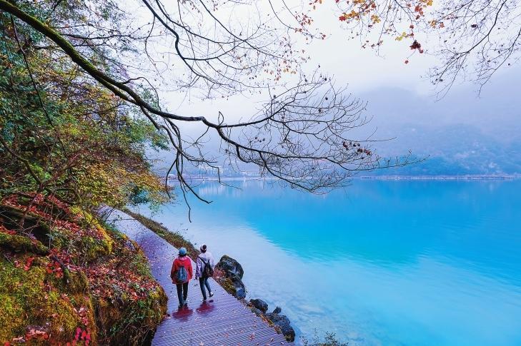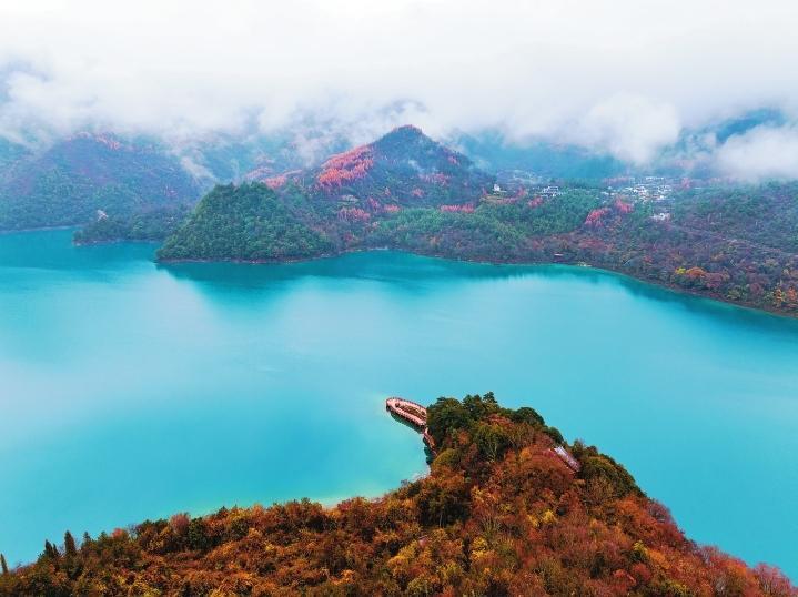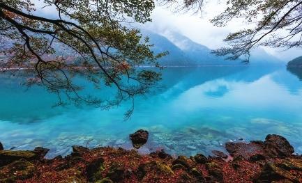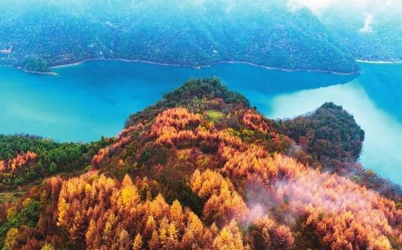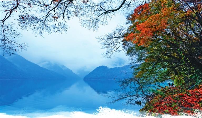 初冬時節(jié),文縣天池國家森林公園尚未褪去秋裝。遠(yuǎn)山峰巒疊嶂,層林色彩斑斕,近水沉斂如鏡,林木倒映其間。黃葉悄落,波紋漣漪,云霧時起,水霧彌漫。初冬的天池,靜美如畫卷。