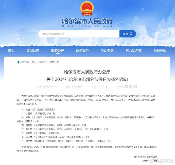 1月5日對(duì)哈爾濱人來(lái)說(shuō)是一個(gè)特別的假期。據(jù)《哈爾濱市人民政府辦公廳關(guān)于2024年哈爾濱市部分節(jié)假日安排的通知》,冰雪節(jié)2024年1月5日(星期五)公休1天。明天,第40屆中國(guó)·哈爾濱國(guó)際冰雪節(jié)將盛大啟幕。