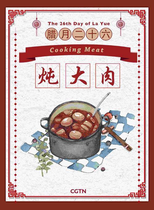 臘月二十六這天,許多家庭通常都會(huì)燉豬肉和吃豬肉。不養(yǎng)豬的家庭會(huì)去當(dāng)?shù)丶匈I一大塊肉。在過(guò)去的農(nóng)業(yè)社會(huì),人們只有在春節(jié)才能吃上肉。吃肉也代表著一年中最盛大的慶?;顒?dòng)。