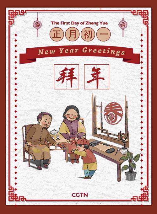 Embracing the first day of the New Year, people visit friends and relatives' homes and make New Year's greetings to each other. They use auspicious words to pray for good luck in the New Year.
