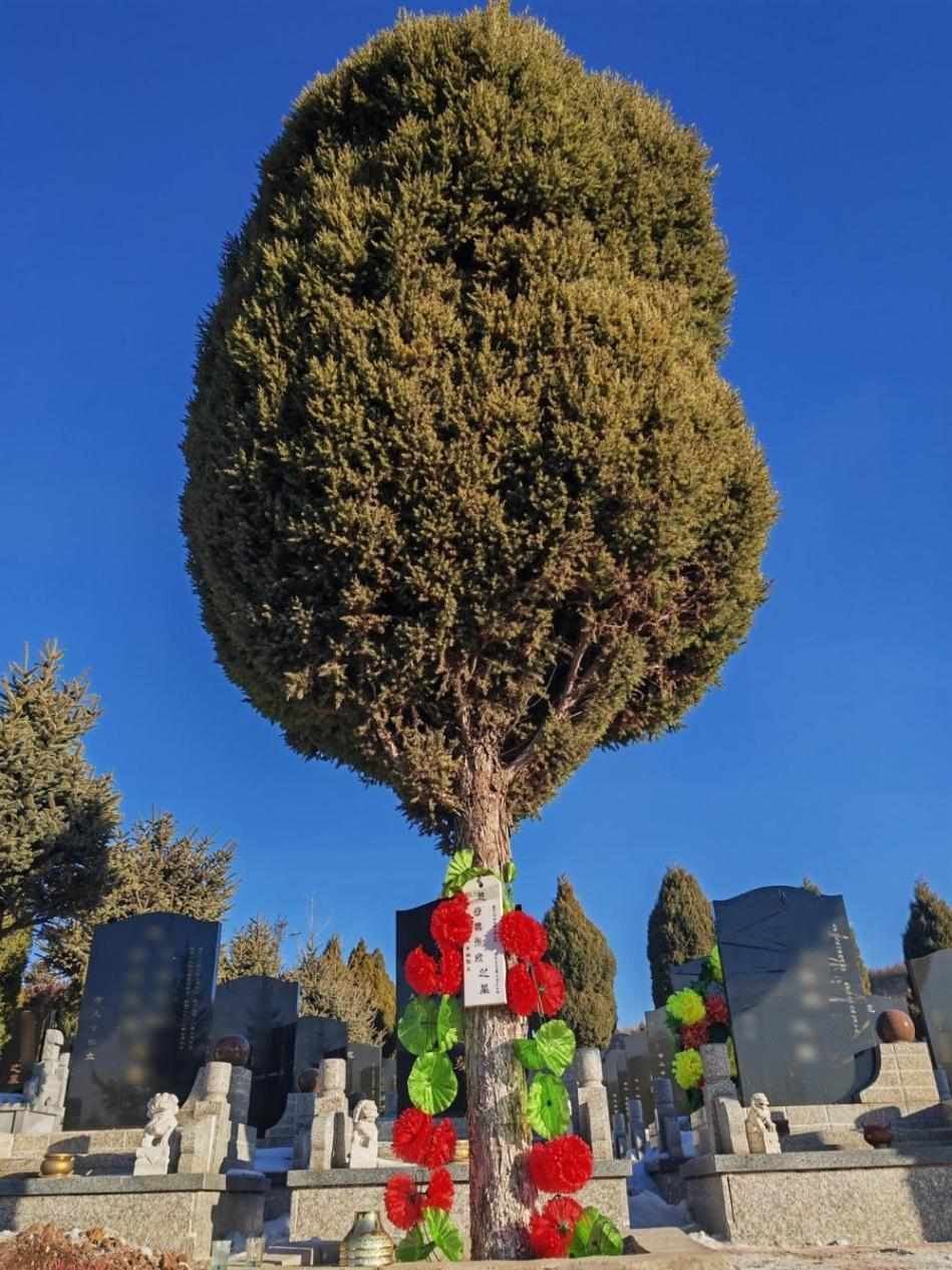 遼寧阜新市公墓的東南角,一棵挺拔翠綠的柏樹樹干上,掛有一個(gè)長30厘米、寬10厘米的小木牌,上寫有“魏彤欣之墓”,一束花環(huán)環(huán)繞周圍,在陽光的照耀下格外絢麗。
