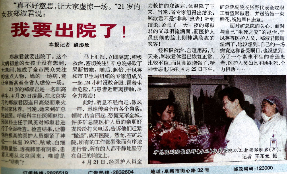 作為部門領(lǐng)導(dǎo),她依然表現(xiàn)出色,2003年“非典”期間,她擔(dān)任阜新晚報(bào)要聞部主任,她提出“最危險(xiǎn)的地方,我先上!”4月20日,有一個(gè)學(xué)生從北京回來,因?yàn)楦邿煌吮粦岩蔀楦腥?ldquo;非典”,一時(shí)間謠言四起,恐慌籠罩全城,魏彤欣一個(gè)人冒著風(fēng)險(xiǎn)深入醫(yī)院跟蹤采訪,在得知確診不是“非典”后,第一時(shí)間發(fā)出了報(bào)道《我要出院了》,及時(shí)消除了公眾恐慌情緒。她帶領(lǐng)記者深入發(fā)熱門診、城市出入口的檢查站和醫(yī)護(hù)人員之間,掌握了大量的一手材料,共采寫了70余篇稿件,她本人被評(píng)為“遼寧省抗擊非典新聞宣傳先進(jìn)個(gè)人”,她所在的部門被評(píng)為“遼寧省抗擊非典新聞宣傳先進(jìn)集體”。