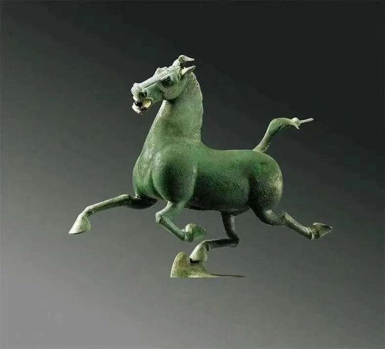 銅奔馬高34.5厘米,長(zhǎng)45厘米,寬13.1厘米,重7.3千克,三足騰空,一足超掠飛鷹,昂首長(zhǎng)嘶,以矯健之姿疾足飛馳,僅一足著力支撐起馬身,展現(xiàn)了當(dāng)時(shí)極其卓越的工藝水平。