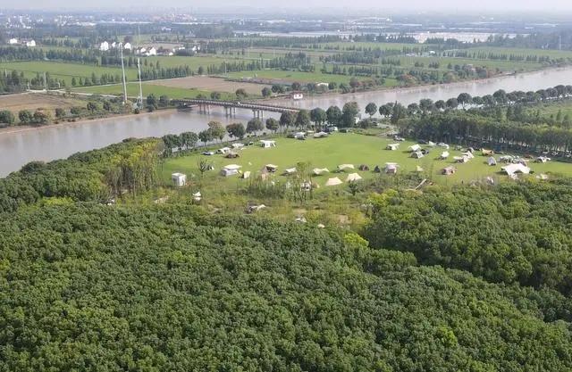 在上海松江區(qū)一處營地,市民游客在河邊草地上搭起帳篷。(2023年9月29日,無人機(jī)照片)。新華社記者 方喆攝