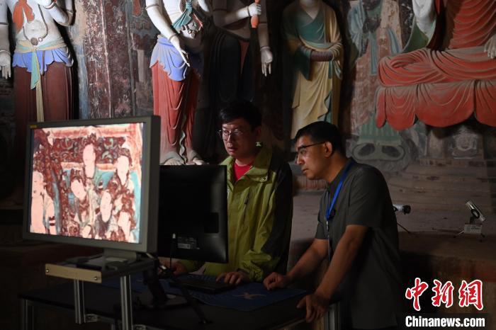 6月5日,敦煌莫高窟內,敦煌研究院文物數(shù)字化研究所工作人員進行敦煌壁畫數(shù)字化圖像現(xiàn)場檢查工作。中新社記者 李亞龍 攝