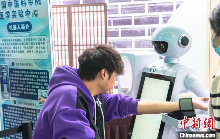 “灸童中醫(yī)藥文化周”活動(dòng)上觀(guān)眾體驗(yàn)與機(jī)器人互動(dòng)。中國(guó)科技館供圖