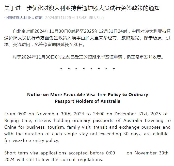 據(jù)“中國駐澳大利亞大使館”微信公眾號(hào)消息,自北京時(shí)間2024年11月30日0時(shí)起至2025年12月31日24時(shí),中國對澳大利亞持普通護(hù)照人員試行單方面免簽政策入境事由擴(kuò)大至來華經(jīng)商、旅游觀光、探親訪友、過境、交流訪問,免簽停留期限延長至30日。