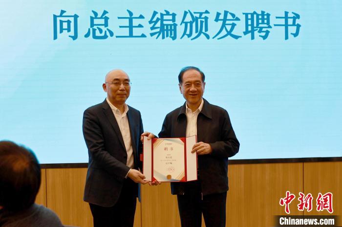 上海世紀(jì)出版集團(tuán)黨委副書記、總裁闞寧輝向韓啟德總主編頒發(fā)聘書。 少年兒童出版社 供圖
