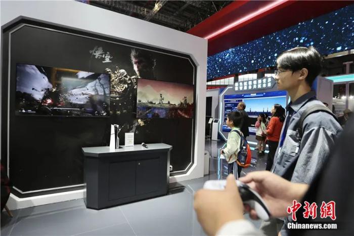 2024年11月5日至10日,第七屆中國(guó)國(guó)際進(jìn)口博覽會(huì)在上海舉辦。圖為11月9日觀眾在中國(guó)館體驗(yàn)游戲《黑神話(huà):悟空》。中新社記者 王紫儒 攝