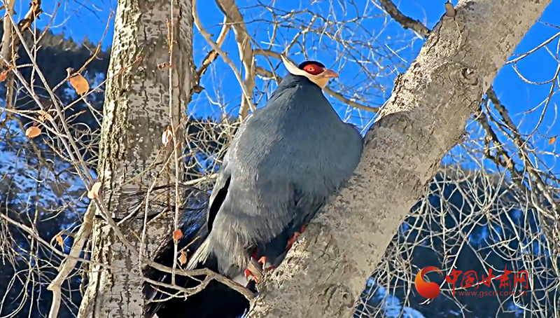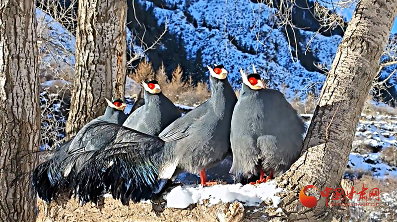 巡護員用鏡頭記錄下畫面,二十余只藍馬雞宛如冰雪精靈,在銀裝素裹的喬木林間愜意“聚會”。三五成群的藍馬雞用強健有力的爪喙翻動雪層,精準(zhǔn)定位埋藏的草籽,專心干飯。距地面十余米的楊樹上,擔(dān)任警戒的“哨兵”不時發(fā)出低沉的咕嚕聲,蓬松的尾羽在陽光下流轉(zhuǎn)著金屬般的光澤。最引人注目的當(dāng)數(shù)林間空地上的“時裝秀”了,“模特”們輪流抖動藍黑漸變的羽毛,頸后白色耳羽簇如流蘇輕顫,精彩的表演折服了五位“評委”,它們個個目不轉(zhuǎn)睛,生怕漏掉每一個演出細節(jié)。這場持續(xù)數(shù)小時的藍馬雞“聚會”也為祁連山國家公園生態(tài)系統(tǒng)健康運轉(zhuǎn)做出了生動注腳。