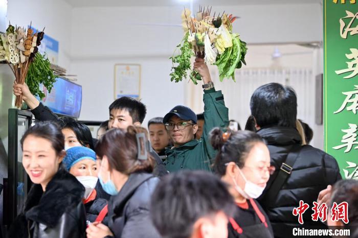 2024年3月14日,甘肅天水,游客手舉挑選的麻辣燙食材。九美旦增 攝