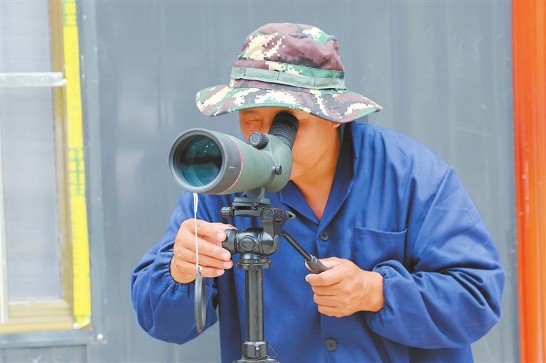 宋治平通過單筒望遠(yuǎn)鏡觀察朱鹮。 新甘肅·甘肅日?qǐng)?bào)記者 馮樂凱