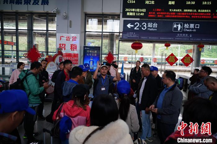 3月16日,云南省紅河州河口縣河口北站,一位導(dǎo)游組織越南旅游團(tuán)候車。中新社記者  劉冉陽(yáng)  攝