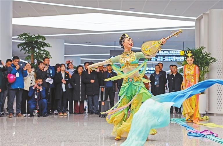 3月20日,在T3航站樓國內(nèi)到達(dá)層,文藝工作者為旅客表演經(jīng)典舞劇《絲路花雨》片段。