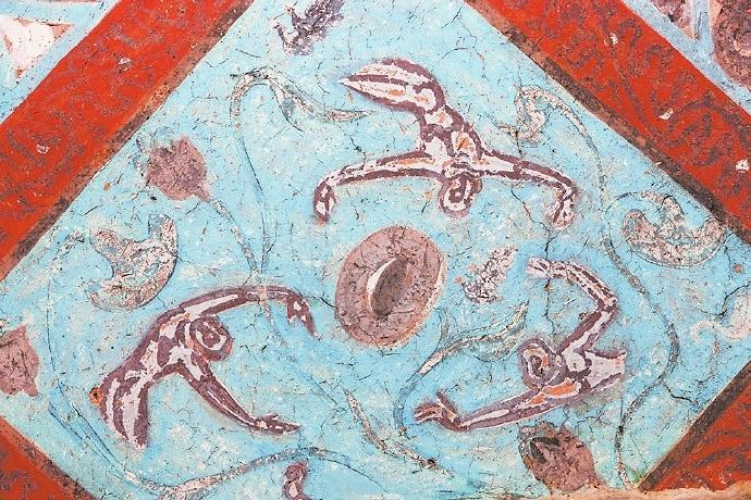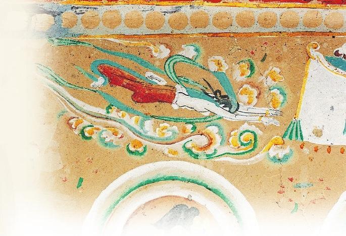 在許多人的認(rèn)知里,飛天是唯美曼妙的化身。在敦煌的許多壁畫中有大量的飛天形象,但是你知道嗎?在這些壁畫中除了凌空飛躍的飛天外,還有不少水中的飛天。在莫高窟第329窟壁畫中有一幅“潛水式飛天圖”:畫面中的一位飛天身著赭紅色長裙,藍(lán)色飄帶纏身,雙手伸展前伸,似乎正在水中遨游。畫面唯美而靈動,在曼妙中透著健碩,使人過目難忘。