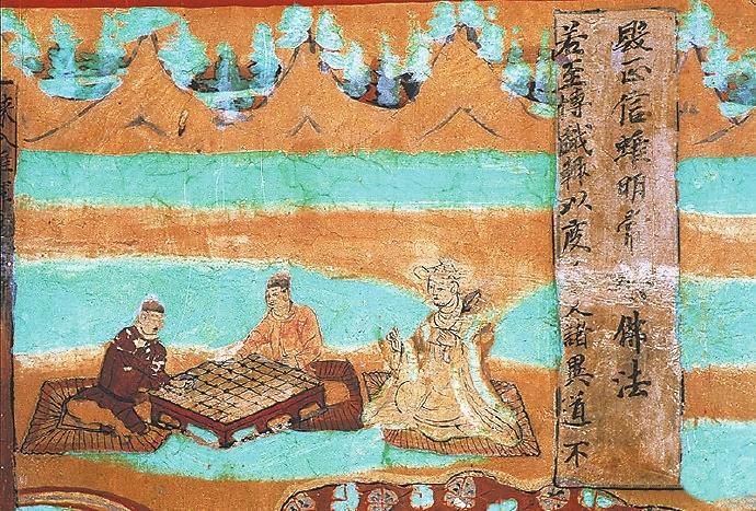 在敦煌壁畫中有關(guān)對弈的內(nèi)容較多。在莫高窟第454窟、第7窟壁畫中都有“弈棋圖”。兩幅圖的畫面有不少類似的地方:一是畫師較為突出棋盤的位置,兩幅壁畫中的棋盤都居中且形制相對巨大;二是畫面上的人物均為三人,兩人對弈,一人觀戰(zhàn),“觀棋不語真君子”;三是對弈者身后的景色都是天朗氣清、遠(yuǎn)山含黛。據(jù)說,一天,北宋大文豪蘇東坡與摯友黃庭堅正在松樹底下弈棋。一陣風(fēng)吹來,松果掉進(jìn)棋盤。蘇東坡隨即吟道:“松下圍棋,松子每隨棋子落。”黃庭堅馬上回答道:“柳邊垂釣,柳絲常伴釣絲懸。”雅趣十足。其實(shí),棋局里的一動一靜、一招一式無不需要謹(jǐn)小慎微、穩(wěn)扎穩(wěn)打。而對弈時的當(dāng)斷則斷、示假隱真、有效合作等戰(zhàn)術(shù)不僅是對弈的智慧,也是人生的哲理吧。
