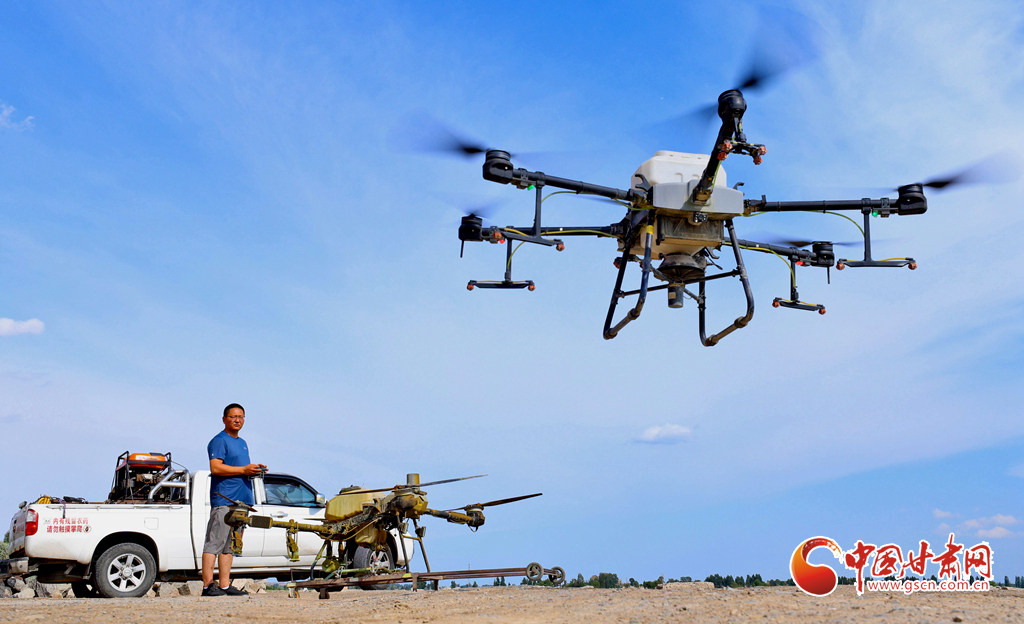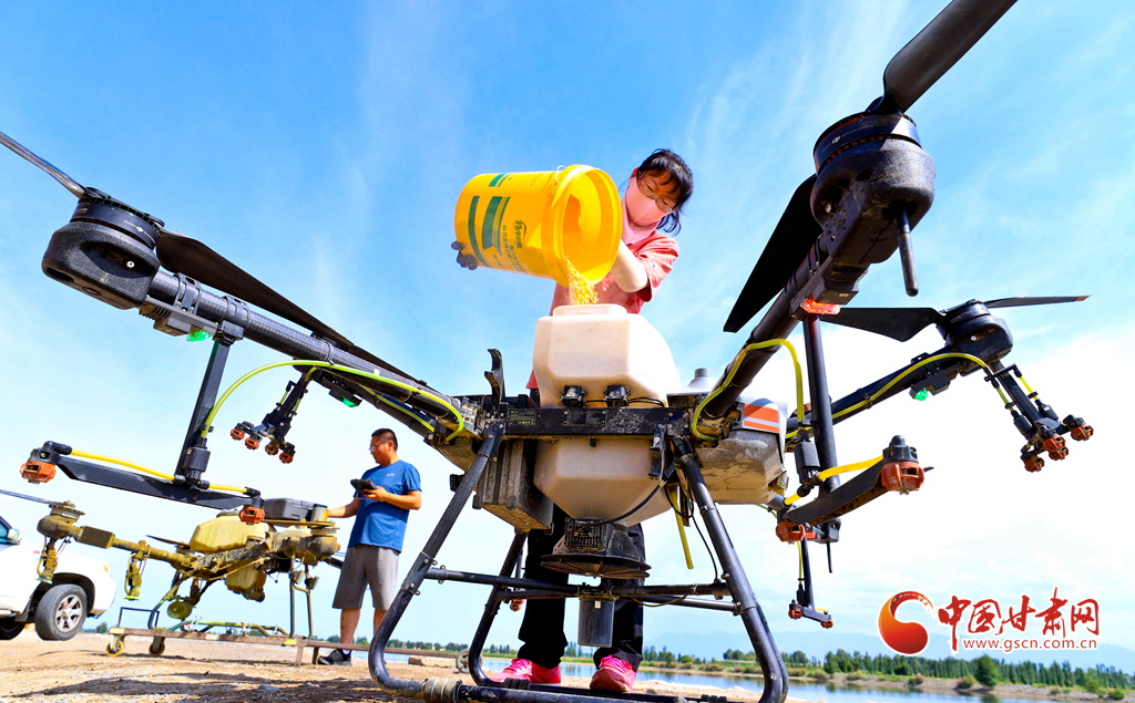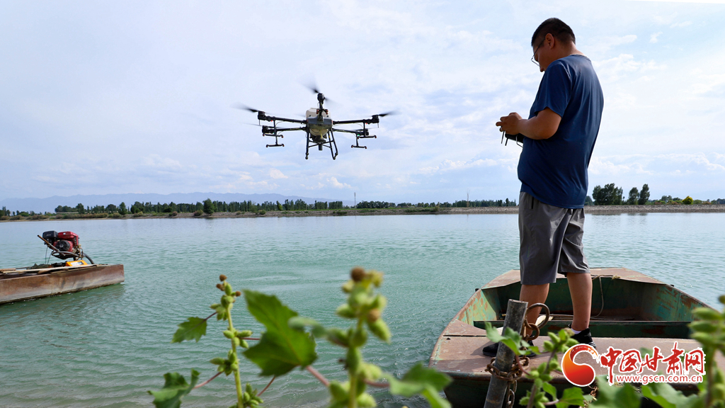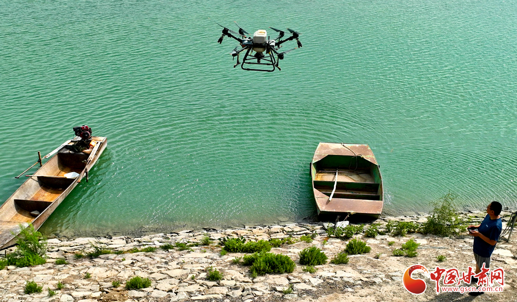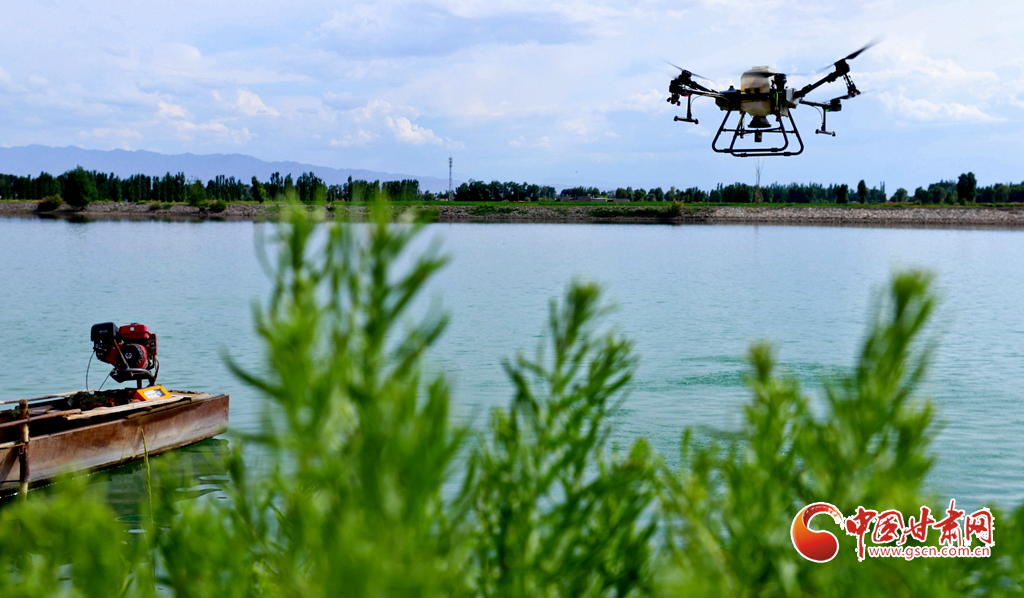 6月24日,在高臺縣夾溝湖水庫螃蟹養(yǎng)殖基地,無人機(jī)操作手啟動設(shè)備,載滿飼料的無人機(jī)沿預(yù)設(shè)航線在800多畝螃蟹養(yǎng)殖基地上空精準(zhǔn)投喂。
