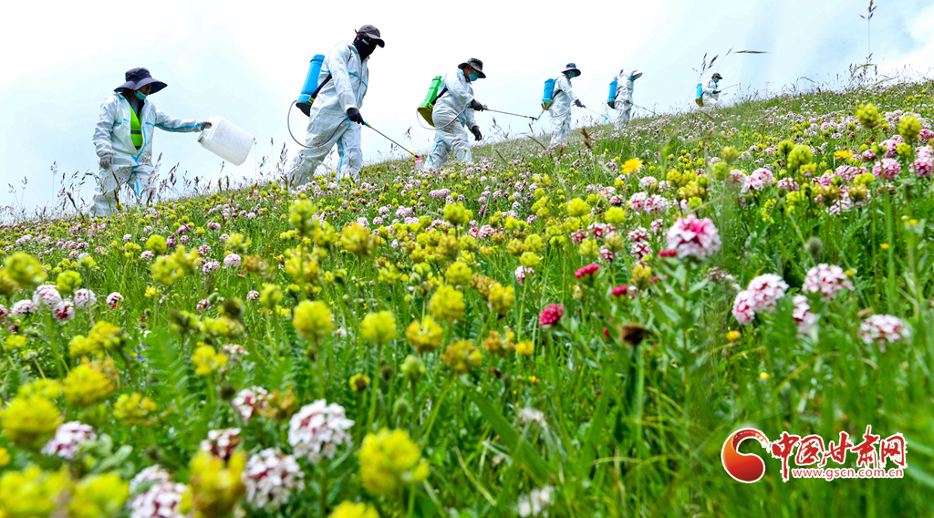 盛夏時(shí)節(jié),位于張掖市肅南裕固族自治縣的皇城夏日塔拉草原、康樂賽汗塔拉草原,宛如一塊巨大的綠色絨毯鋪向天際,滿目翠綠,令人心醉神迷。然而,此時(shí)也正是草原上狼毒花毒害草盛放、蝗蟲繁殖的高峰期。連日來,肅南縣林草專業(yè)技術(shù)人員帶領(lǐng)2000多牧民,抓住毒害草開花、蝗蟲繁殖最快,也是清除滅殺的最佳時(shí)機(jī),在“三北”工程六期160多萬畝廣袤的草原上,打響了以“蟲害防治+害草治理+噴施葉面+播撒草籽的”為核心的“三北”工程林草濕荒一體化保護(hù)修復(fù)攻堅(jiān)戰(zhàn)。