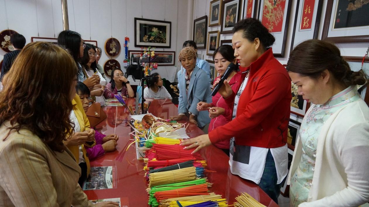 (唐彩萍在安曼為約旦王妃和公主及嘉賓現(xiàn)場(chǎng)制作麥稈畫)
