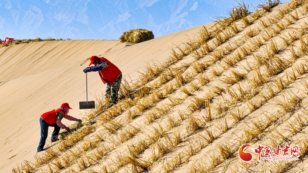 連日來,在張掖市肅南裕固族自治縣明花鄉(xiāng)西南部的干旱荒漠區(qū),運草車輛往復穿梭,1600余名治沙工人于巴丹吉林沙漠西南緣的沙丘間忙碌作業(yè)。他們劃線、背草、俯身鋪草、揮鍬壓埋,全力營建沙障與固沙林帶,為沙漠牢牢“鎖邊”。
