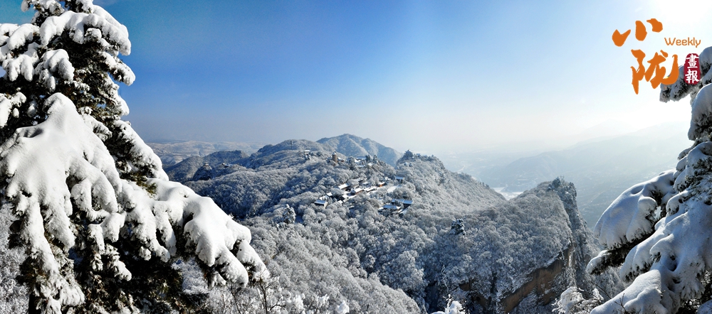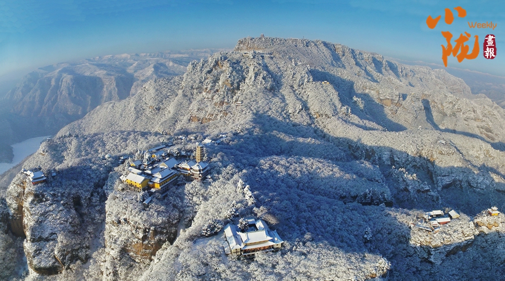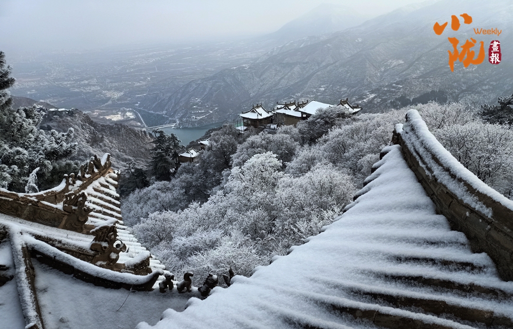 群山裹素,起伏的線條在極致湛藍(lán)的天穹下舒展,積雪壓彎枝頭,形成道道玉弧。而點(diǎn)綴其間的廟宇樓閣,默然佇立,飛檐上的殘雪泛著微光,與這片寧靜的藍(lán)白色調(diào)共同構(gòu)成一幅和諧、安詳?shù)男麓貉┚啊?/p>