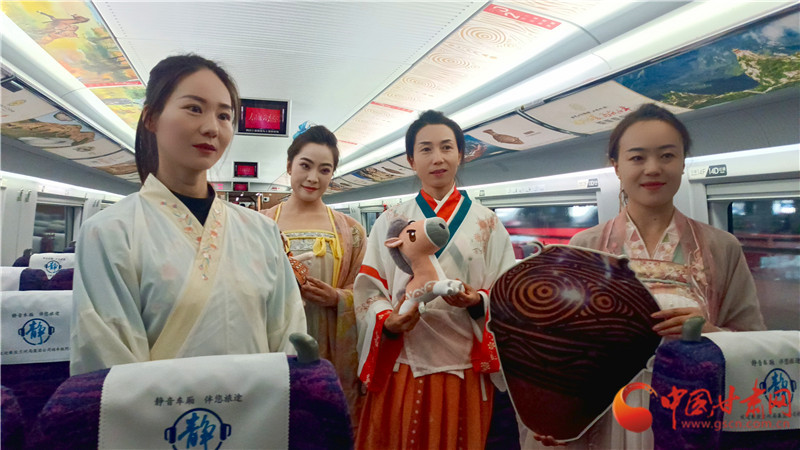 這趟列車,是敦煌研究院、甘肅省博物館、甘肅簡(jiǎn)牘博物館、蘭州市博物館、天水市博物館、武威市博物館、平?jīng)鍪胁┪镳^、臨夏州彩陶館(州博物館)、和政古動(dòng)物化石博物館九家國(guó)家一級(jí)博物館聯(lián)袂打造的“高鐵流動(dòng)博物館”。