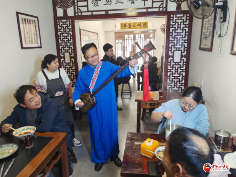 當日,北關(guān)市場內(nèi)人流如注、熙熙攘攘,眾多游客與市民齊聚于此,享受美味的同時觀看涼州賢孝和永昌滾燈,涼州賢孝傳承人賈旭峰與用餐的游客進行了互動,人們安逸地享受著這份獨具涼州特色的煙火美味。