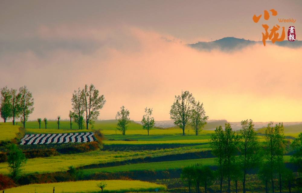 晨霧為華亭的春景蒙上柔紗,遠山在霞光里若隱若現(xiàn)。層層梯田鋪展著嫩綠與明黃,田壟間覆著的條紋地膜泛著細光,疏朗的樹木錯落點綴,一派朦朧又鮮活的春野意趣。