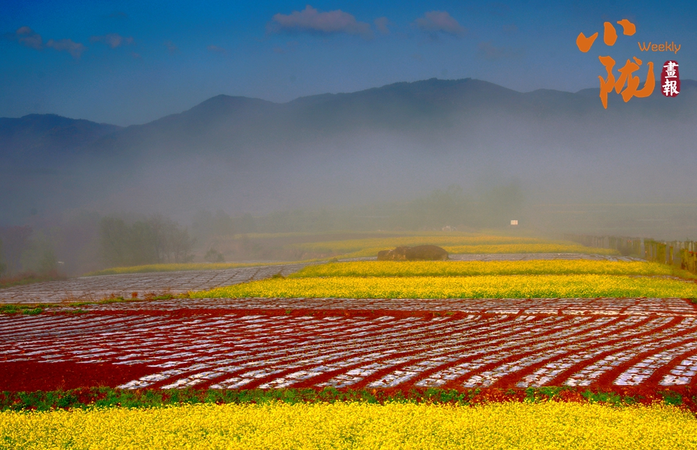 晨霧漫過山巒,梯田鋪展成彩色織錦,黃花似金浪翻涌,紅花如霞錦鋪陳,遠山含黛,天地間滿是春日的鮮活與詩意。